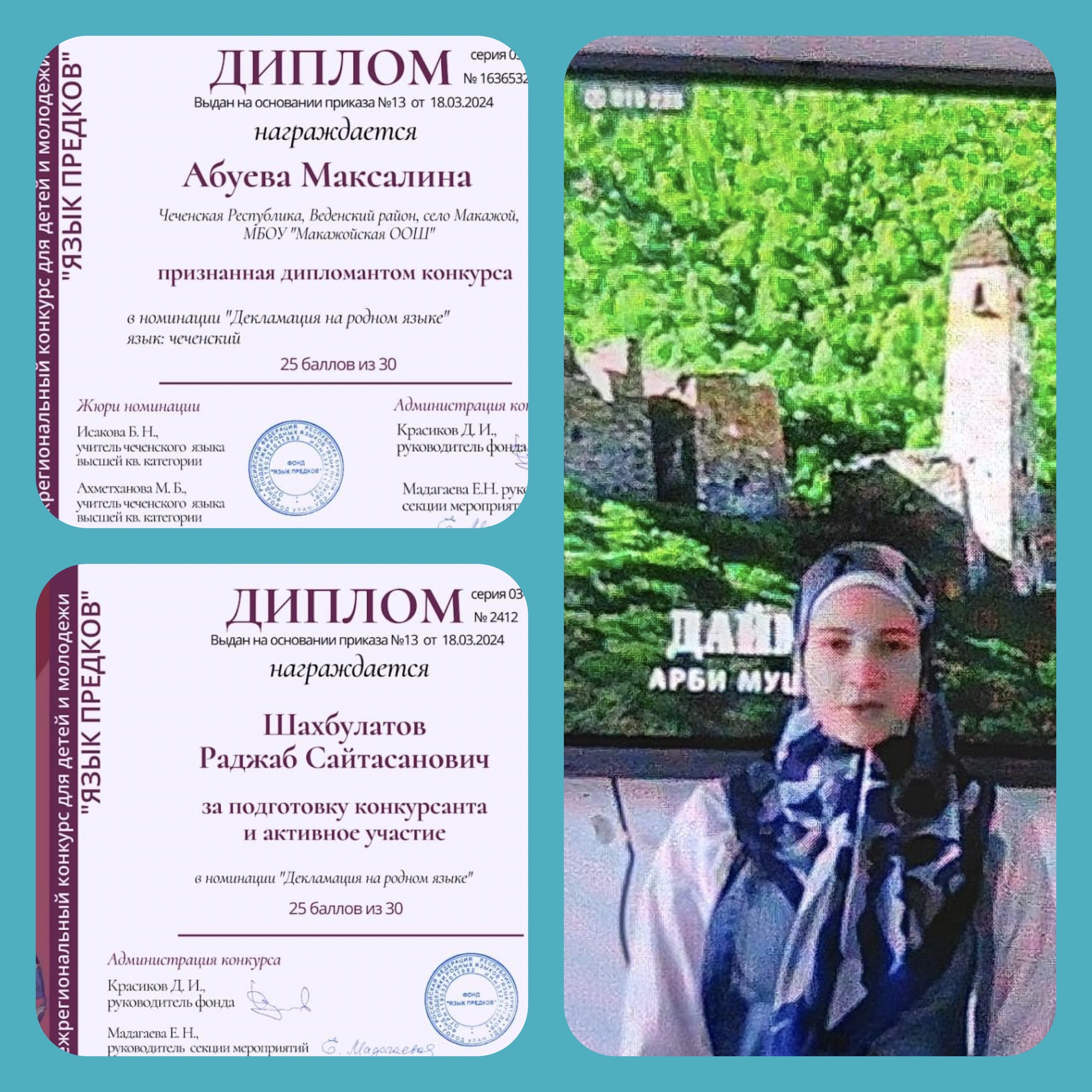 Абуева Максалина, ученица 7-го класса МБОУ "Макажойской ООШ", стала дипломантом Межрегионального конкурса для детей "Язык предков".