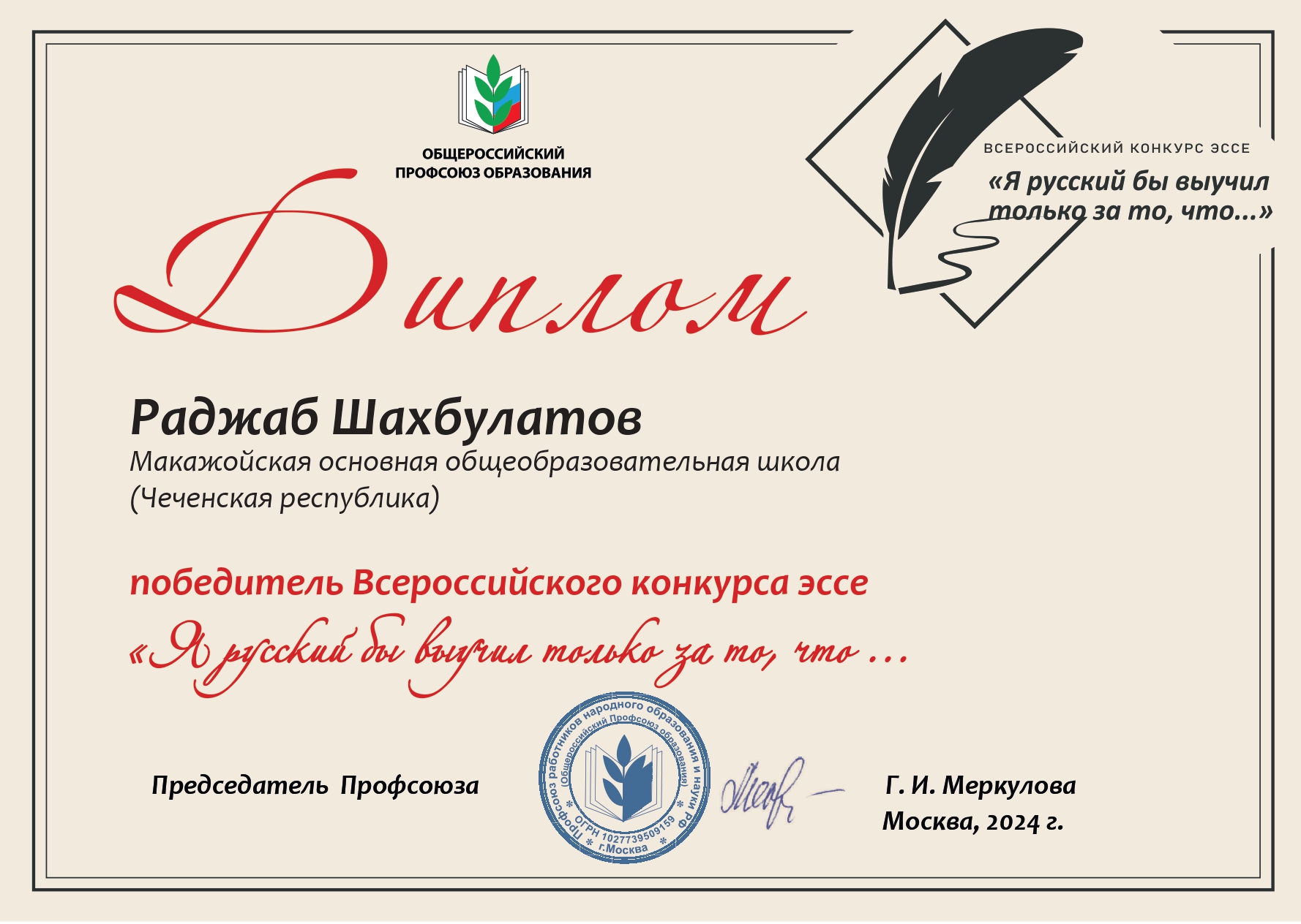Шахбулатов Раджаб - победителем Всероссийского конкурса эссе «Я русский бы выучил толькоза то, что...»
