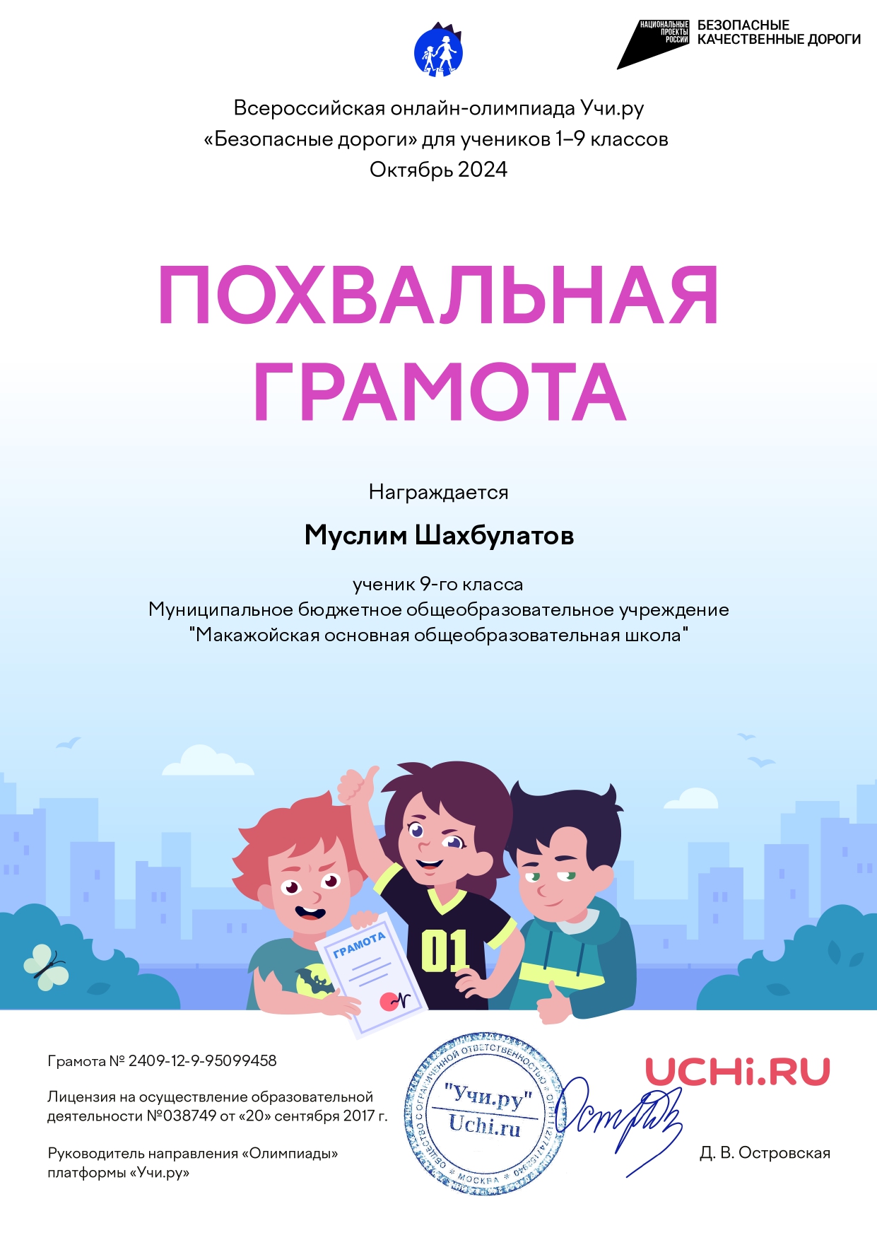 29.10.2024Поздравляем Шахбулатова Муслима, ученика 9-го класса победителя всероссийской онлайн - олимпиады "Безопасные дороги".