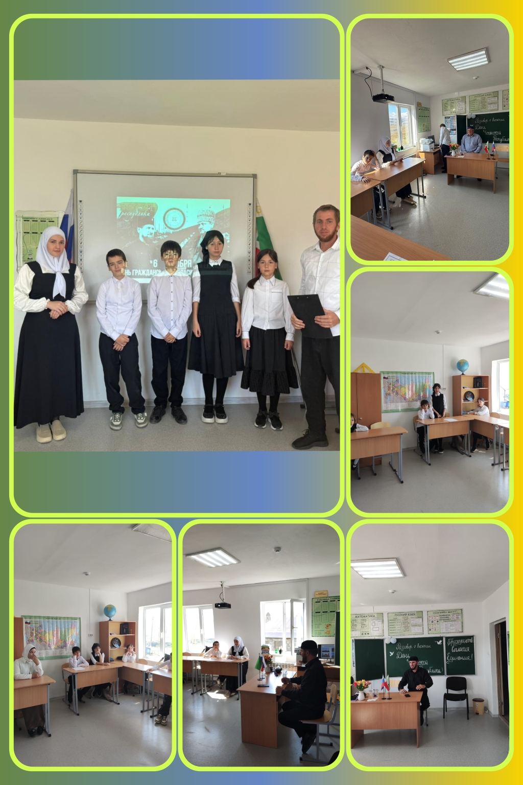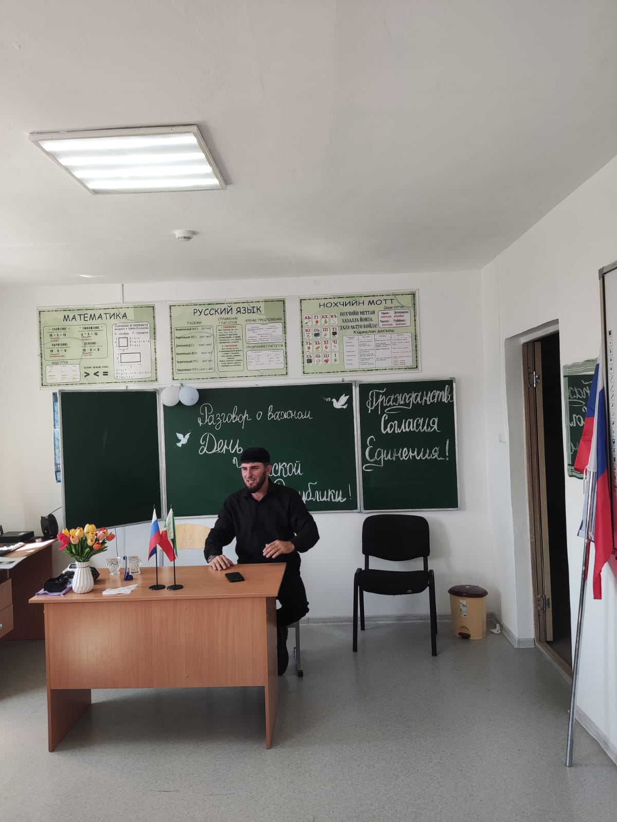 8 сентября 2025 г классный руководитель 6 класса Шахбулатов Р. С. провёл классный час «День Чеченской республики». Была проведена беседа о подвиге первого президента Чеченской республики, героя России Ахмата-Хаджи Кадырова. Была ярко, красочно оформлена доска. Дети читали стихотворения про свою Родину, столицу ЧР .