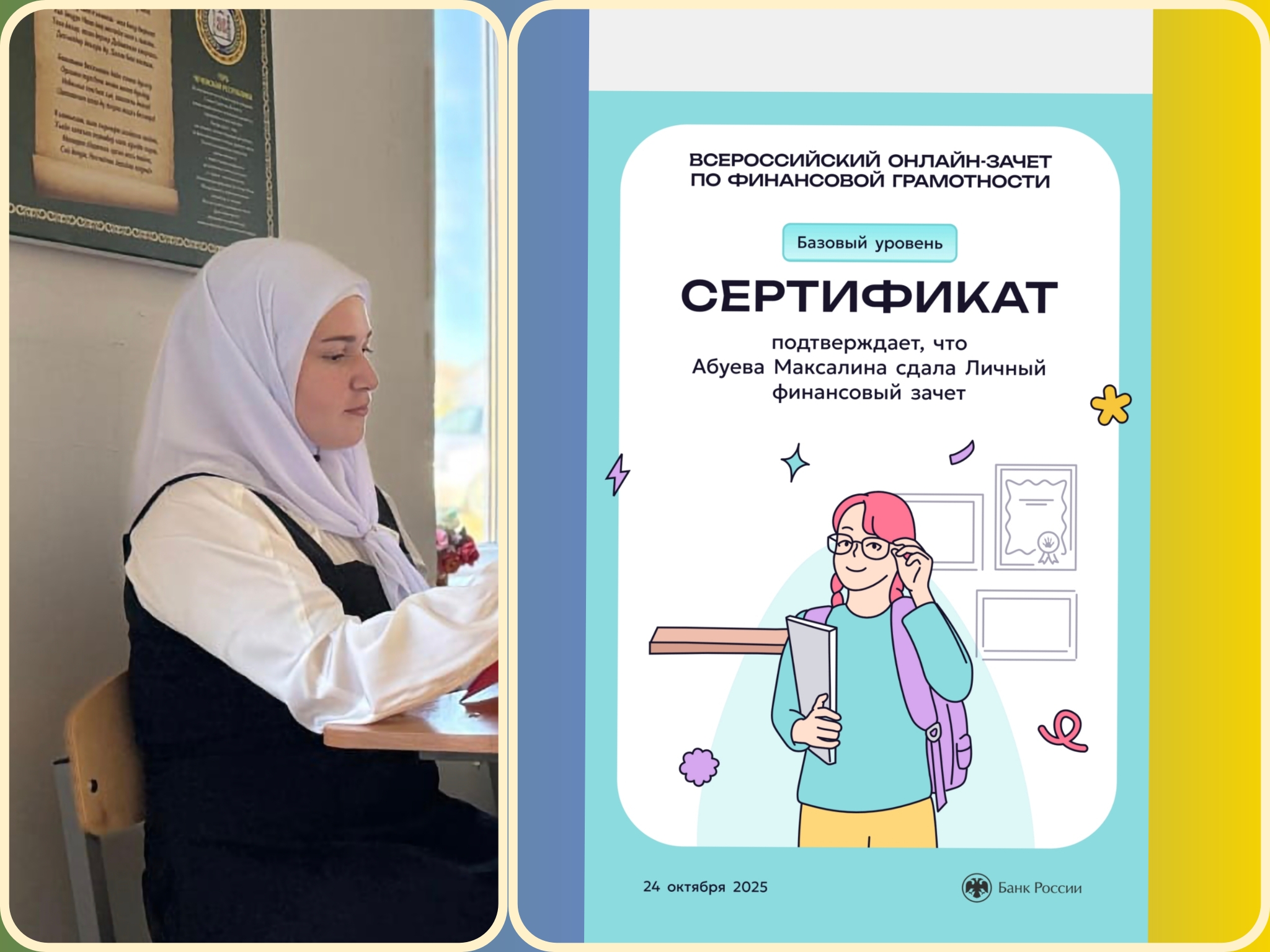 21.10.2025Ученица 9-го класса успешно сдала Всероссийский онлайн-зачет по финансовой грамотности.
